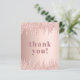 Un carte de remerciements pour un 50ème anniversaire (ou tout âge). Or rose, couleur arrière - plan rose. Avec des gouttes. Sur l'avant, de grandes lettres roses foncées en or coloré et le texte : Merci. Retour : Personnalisez et ajoutez Votre note de remerciement et votre nom. Le nom est écrit avec un script de style moderne écrit à la main.