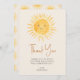 Ce carte de remerciements de baby shower au thème du soleil présente un joli soleil souriant jaune et une typographie stylée sur un arrière - plan crème. L'arrière est décoré d'un motif solarium. Facile à personnaliser. Aquarelle originale © Michele Davies.