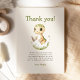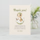 Ce mignon carte de remerciements de baby shower présente un bébé dinosaure beige et vert à l'eau qui coule de son oeuf, sous les mots "Merci" dans l'impression à la main verte. Personnalisez le texte avec votre message en caractères sans serif gris fusain et en ligne de signature imprimée à la main verte.