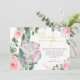 Cette adorable carte de remerciements présente une végétation élégante, des roses roses et un mignon petit éléphant.