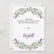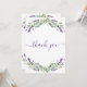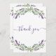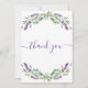 Un carte de remerciements d'anniversaire féminin et élégant. Un arrière - plan blanc, décoré de lavande, de fleurs violettes et de verdure d'eucalyptus. Sur l'avant grand main écriture et le texte : Merci. Retour : Personnalisez et ajoutez Votre note de remerciement et votre nom. Le nom est écrit avec un script de style moderne écrit à la main.