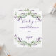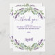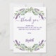 Un carte de remerciements d'anniversaire élégant. Un arrière - plan blanc, décoré de lavande, de fleurs violettes et de verdure d'eucalyptus. Sur l'avant grand main écriture et le texte : Merci. Personnalisez et ajoutez Votre note de remerciement et votre nom. Le nom est écrit avec un script de style moderne écrit à la main.