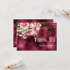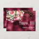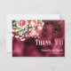 Un élégant carte de remerciements de mariage avec des roses roses sur un faux papier d'aluminium bordeaux et un arrière - plan de parties scintillant d'or.