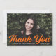Carte de remerciements de graduation simple et élégante avec la photo horizontale du diplômé avec "Merci" dans une écriture orange audacieuse. Personnalisez le devant du carte de remerciements de remise de diplômes en y ajoutant le nom du diplômé, le nom de l'école et l'année de remise de diplômes. La carte s'inverse pour afficher votre message dactylographié ou manuscrit avec un arrière - plan de motif d'arc géométrique orange et blanc.