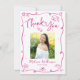 Assurez-vous que votre diplômé préféré montre son appréciation à tous ceux qui ont soutenu leur événement marquant ! Envoyez cette carte de remerciement photo personnalisée, originale, ludique, simple et moderne. Sur le devant, une typographie manuscrite rose vif amusante et des gribouillages de croquis d'icônes de graduation dessinés à la main, ainsi que votre photo personnalisée, se superposent sur un fond blanc minimal. Ajoutez la photo de votre choix et personnalisez le texte avec le nom de votre diplômé et l'année de promotion. Au verso, tapez votre message personnalisé ou supprimez le texte pour pouvoir écrire votre propre note manuscrite. Des invitations, des étiquettes d'adresse, des bannières, des autocollants, des éventails et d'autres cadeaux de remise de diplôme assortis sont également disponibles dans cette collection tendance et élégante. Garantit d'ajouter une touche stylée à leur correspondance !