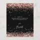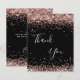 Un carte de remerciements d'anniversaire féminin et élégant. Une couleur noire arrière - plan. Avec des confettis en or rose. Sur le devant, script écrit à grande main et texte : Merci. Retour : Personnalisez et ajoutez Votre note de remerciement et votre nom. Le nom est écrit avec un script de style moderne écrit à la main.