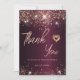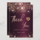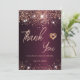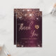 Une carte de remerciements pour une Quinceañera, 15ème anniversaire. Une couleur arrière - plan bordeaux. Avec parties scintillant rose en or faux, étincelles et un coeur. Sur le devant un script écrit à grande main et le texte : Merci, votre texte, titre et une date. Retour : Personnalisez et ajoutez votre note de remerciement et votre nom.