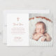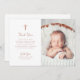 Cette carte de remerciements de baptême ou de baptême religieuse blanche, simple et élégante, de style rose, présente une typographie de scénario fantaisiste, de style vintage et une croix d'or rose avec votre photo. Un style élégant, classique et minimaliste qui reste unique et contemporain.