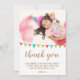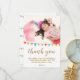Jolie carte de remerciement avec drapeau de guirlande pour l'anniversaire de votre fille ou garçon. Remerciez vos invités d'être venus à la fête d'anniversaire de votre enfant ! Le design comporte des drapeaux de guirlande multicolores aux couleurs verte, bleue et rouge et une photo - insérez la photo de votre enfant dans le modèle. Le texte est écrit dans un style tendance - modifiez le message de remerciement si vous le souhaitez ainsi que le nom de l'enfant.