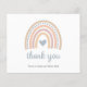 Carte de remerciements de Baby shower à petit budget avec un arc-en-ciel boho aux couleurs pastel muet avec un coeur bleu au milieu. Ci-dessous est "merci" en script avec les noms de Maman-to-Be et Baby. Le côté arrière a votre message personnalisé. Ce carte de remerciements personnalisé vous permet d'envoyer vos cartes de remerciements rapidement et facilement.