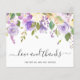 Carte de remerciements à budget fleuri pourpre avec une bordure supérieure de fleurs aquarellées dans les tons violet pastel, lavande, lilas et ivoire. Ci-dessous est "amour et merci" avec vos noms. Le dos a votre message personnalisé. Cet élégant carte de remerciements de mariage est parfait pour un mariage de printemps ou d'été.