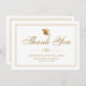 Envoyez un élégant carte de remerciements à votre famille et à vos amis pour les remercier de leur soutien. Ce dessin présente l'illustration d'un capuchon de graduation sur le devant avec un faux script d'or classique sur un arrière - plan blanc qui lit. "Merci" avec votre nom, l'école et la classe/année ci-dessous pour personnaliser accentué par un cloison doré. Le dos de la carte comporte un message et une signature personnalisés. Conçu par l'artiste ©Susan Coffey.
