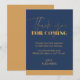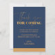 Montrez votre gratitude avec style avec la carte de remerciement d'anniversaire élégante Navy Gold Chic. Le devant présente un fond bleu marine élégant qui se fond dans une base dorée luxueuse, créant un contraste sophistiqué qui attire immédiatement l'œil. En haut, un script doré gras lit « merci d'être venu », suivi d'un message de remerciement sincère et de « amour + [nom] » en lettrage doré assorti. Le verso continue l'élégance avec un fond doré lisse, offrant un espace généreux pour une note personnelle. Cette carte de remerciement d'anniversaire Navy Gold Chic est parfaite pour les anniversaires de tous âges, offrant une façon intemporelle, chic et élégante d'exprimer votre appréciation. ✨🥂