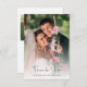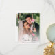 Envoyer cette carte de remerciement de mariage avec écriture moderne à vos invités de mariage est une merveilleuse façon d'exprimer votre gratitude tout en partageant 2 photos de votre journée spéciale. Les lignes épurées et le style moderne offrent un look soigné qui est sûr d'impressionner ! Cette carte est personnalisée avec une photo spéciale de votre jour de mariage, ainsi que la date et le lieu de votre cérémonie. Le verso comprend une autre photo spéciale et un message à vos amis et à votre famille. Le texte est entièrement personnalisable, vous pouvez donc ajouter votre propre message si vous le souhaitez, ou utiliser le nôtre comme inspiration. Choisissez parmi une variété de tailles de cartes et de types de papier.
