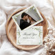 An elegant wedding photo thank you card featuring soft white flowers, delicate greenery, and a refined gold frame for a timeless romantic look. The airy botanical details beautifully surround your favorite wedding photo, creating a polished design that is perfect for formal celebrations, garden weddings, and coordinated wedding stationery suites. A beautiful choice for couples who love soft floral wedding accents with a fresh, classic, and sophisticated feel. This card is a lovely way to share heartfelt thanks while showcasing a special moment from your wedding day.