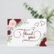 Remerciez vos invitées à la fête de douche de mariée avec ces jolies cartes attentionnées. Le design présente une profusion de roses aquarellées peintes à la main dans des tons de bordeaux, rouge et rose blush ainsi que de la verdure de jardin et de l'eucalyptus. Le devant de la carte porte la mention "Merci" dans une écriture moderne élégante avec des fioritures et des enjolivures, et il y a trois cœurs mignons et romantiques. Au dos, il y a un espace pour une note personnalisée et votre signature. Belle façon d'exprimer votre gratitude alors que vous et vos amies vous réjouissez à l'approche de votre jour de mariage !