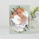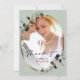 Carte de remerciement de mariage avec photo sur fond vert sauge et calligraphie moderne dorée... Notre élégante carte de remerciement de mariage avec photo eucalyptus présente un cadre ovale métallisé doré orné de feuilles d'eucalyptus d'un vert émeraude bordant une photo des mariés sur un fond vert sauge clair. Votre photo sera placée sur une couche sous une transparence blanche pour "estomper" les couleurs en bas, de sorte que le graphique "Merci" en calligraphie moderne et les noms des mariés en texte serif classique soient lisibles. Le dos de la carte en vert sauge affiche un texte que vous pouvez conserver ou réviser pour votre message de remerciement personnel, ainsi qu'un exemple de code QR que vous pouvez facilement réviser avec le lien de votre site web de mariage. Tout le texte d'exemple (et le code QR) peut être révisé avec vos propres informations sur le modèle de personnalisation. Fait partie d'une suite de mariage avec des accessoires coordonnés dans