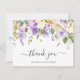 Carte de remerciement de sympathie fleurs violettes avec une bordure supérieure de fleurs peintes à l'aquarelle dans des tons de violet pastel, lavande, lilas et ivoire. En dessous, « merci » est écrit en script avec le nom de famille du défunt. Le dos comporte votre message personnalisé. Un choix élégant pour remercier les invités des obsèques d'un être cher.