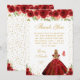 Cette élégante et glamour carte de remerciement d'anniversaire présente une belle princesse aux cheveux blonds et à la peau claire dans une robe rouge. Le texte combine une écriture manuscrite et des polices modernes sans serif pour un look classe et sophistiqué. Les arrangements floraux, les papillons et les confettis dorés créent le mélange parfait de rustique et de chic.