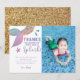 Carte de remerciement de modèle de fête d'anniversaire pour enfants Magique et fantaisiste sur le thème Sous la mer avec une queue de sirène en rose, violet et sarcelle avec des écailles de paillettes dorées. Le texte dit "merci de faire de ma fête un tel splash". Le texte ci-dessous dit "merci de faire la fête avec moi". Vous pouvez ajouter la photo de votre enfant à côté du message. Personnalisez ce produit en ajoutant le nom de votre enfant en bas.