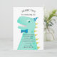 Carte de remerciement drôle et mignonne pour la fête d'anniversaire sur le thème des dinosaures de votre enfant. Illustration de style cartoon d'un dinosaure vert avec des pointes jaunes. Le T-Rex porte un nœud papillon bleu et un petit chapeau de fête. Au-dessus du T-Rex, il est écrit "Merci d'être venu". Personnalisez ce produit en ajoutant le nom de votre enfant en bas.