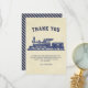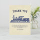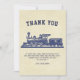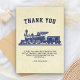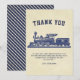 Jolie carte de remerciement pour une fête sur le thème du train. Personnalisez-la avec le nom de votre enfant.