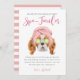 Jolie carte de remerciement en papier à thème spa pour fête d'anniversaire avec illustration d'un chien Charles King Spaniel étant choyé avec un bandeau rose et des concombres sur les yeux. Le texte en haut dit "merci de rendre ma fête spa-taculaire". Le texte par défaut remercie les invités pour la célébration et le cadeau. Ce design rose est idéal pour une fête de fille.