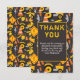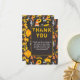 Carte de remerciement thème construction jaune pour l'anniversaire d'un garçon avec tracteur de chantier, cônes de signalisation routière, panneaux de signalisation d'avertissement (comme des chapeaux de sorcière) et autre équipement sur fond gris foncé. Une excellente façon de dire merci à ceux qui ont assisté à l'anniversaire de votre enfant et pour leurs cadeaux. Personnalisez en changeant le titre et en ajoutant votre propre message ; le message actuel dit "merci d'être venu à ma fête, c'était super de t'avoir là et merci pour mon cadeau, amour Mckenzie".