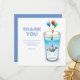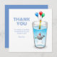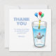 Carte de remerciements avec une jolie illustration de petite baleine. La baleine porte un casquette rayé rouge et blanc et a commencé la fête d'anniversaire qui a lieu dans un verre d'eau rempli.