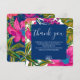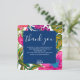 Cette carte de remerciement de fête de mariage florale et botanique comporte des fleurs à l'aquarelle en rose, violet et couleur pêche et des feuilles dans des nuances vives de vert avec un fond rose chaud. Une invitation de fête de mariage floral coloré parfaite