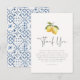 Une carte de remerciement élégante pour accompagner notre collection de carrelage Été Citron & Méditerranée pour une Baby Shower. Ce design présente une belle illustration aquarelle peinte à la main de deux citrons et de fleurs de citronnier suspendus à une branche d'arbre. En dessous, il y a un message de remerciement personnalisé et sincère pour exprimer votre gratitude à vos amis et à votre famille. Le verso du design présente des carreaux italiens bleus peints, ajoutant une touche de charme méditerranéen à ce design. Consultez la collection liée sur cette page pour le set de Baby Shower assorti. N'hésitez pas à m'envoyer un message si vous avez des questions, je serai ravi de vous aider !