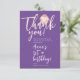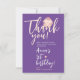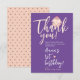 Célébrez le 1er anniversaire de votre petite fille avec cette adorable carte de remerciement de dessin animé féminin, parfaite pour les invités de la fête. Le design présente un adorable lapin bébé rose blush qui enlace un cœur jaune doux, avec un grand script manuscrit « Merci » rose pastel sur un fond violet charmant. Le nom de votre bébé est mis en valeur dans un élégant script blanc moderne, ajoutant une touche personnelle. La typographie blanche épurée assure une lisibilité facile. Le dos de la carte est de couleur pêche pastel avec des pois gris délicats pour une finition sucrée. Entièrement personnalisable, ce charmant souvenir est un moyen sincère de remercier vos proches d'avoir célébré avec vous.