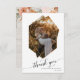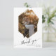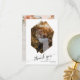 "Carte de remerciement photo géométrique à feuillage floral automnal rustique en or." Une bordure supérieure d'art floral automnal élégant peint à l'aquarelle avec un feuillage de feuilles vertes surplombe un cadre de style géométrique en glitter or rose doux. Votre photographie remplace facilement l'exemple. Une belle police de calligraphie script, "merci" ajoute une touche moderne. Vos noms et date de mariage (ou d'autres informations) sont facilement personnalisables. Au verso se trouve le même feuillage de feuilles et un fond en bois de cottage gris doux qui vous permet d'écrire à la main votre message personnel. Œuvre peinte et conçue graphiquement par l'artiste et designer licenciée à l'international, Audrey Jeanne Roberts, copyright.