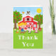 Cette carte de remerciement mignonne et amusante présente une fille aux cheveux blonds et à la peau claire à côté d'une grange rouge avec une girouette en forme de coq. Il y a des animaux de ferme adorables tels qu'une vache, un cochon et une poule. En arrière-plan, on voit un ciel bleu vif, des pommiers, du soleil, des papillons et des marguerites. Le texte combine des polices grasses et sans serif pour un look stylé et moderne. C'est parfait pour une fête d'anniversaire sur le thème de la ferme.