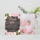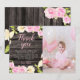 Carte de remerciement de fête d'anniversaire botanique rustique et élégante ! Il y a une couronne de fleurs roses et crème (camélia et magnolia) peinte à l'aquarelle sur un fond en bois. Le message par défaut est déjà là, mais il est modifiable. Personnalisez ce produit en ajoutant le nom de votre enfant en bas et votre propre photo.