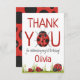 Aquarelle mignonne et girly Ladybug remplaçant la lettre ou dans l'expression Merci, conçu pour le 1er anniversaire de votre fille! L'arrière de l'invitation comporte un rouge avec un motif d'aquarelle noir de taches de coccinelle.