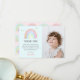 Cette carte de remerciement d'anniversaire moderne et mignonne, présente une photographie de l'enfant qui fête son anniversaire sur un fond bleu turquoise pâle, un arc-en-ciel abstrait à l'aquarelle pastel avec des accents en faux or, des étoiles en faux or et un modèle de remerciement doux qui peut être facilement personnalisé.