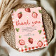 Cette conception de remerciement pour le 1er anniversaire de filles mignonne et fantaisiste présente des illustrations adorables de fraise rose et de fleurs, et peut être personnalisée avec votre propre message de remerciement. Le design « berry first » présente également un motif à carreaux rouges assorti au dos. Le design parfait de la ferme de baies pour l'anniversaire de votre petit !