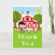 Cette carte de remerciement mignonne et amusante présente un garçon aux cheveux noirs avec une peau claire à côté d'une grange rouge avec une girouette en forme de coq. Il y a des animaux de ferme adorables tels qu'une vache, un cochon et une poule. En arrière-plan, on voit un ciel bleu vif, des pommiers, du soleil, des papillons et des marguerites. Le texte combine des polices grasses et sans empattement pour un look stylé et moderne. C'est parfait pour une fête d'anniversaire sur le thème de la ferme.