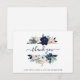 Cette élégante et branchée carte de remerciements à plat mariage présente un cadre d'aquarelle moderne rempli de fleurs de couleur marine. Les fleurs d'hydrangée, de pivoine et d'anémone apparaissent dans les tons bleu marine, bleu clair et rose vif avec des feuilles beiges verts et neutres, sur un arrière - plan blanc.