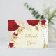 Fleurs romantiques rouges et blanches avec carte de remerciements mariage botanique feuille doré. Les détails de la parties scintillant sont simulés.