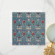 Intricate floral pattern with red, cream, and green leaves on a blue background. Symmetrical design evokes a classic, elegant, and ornate feel.