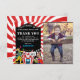 Cartes de remerciement d'anniversaire colorées pour enfants avec un thème cirque/carnaval, présentant une photo de la fille ou du garçon d'anniversaire, un clown jongleur, un maître de piste, une tente de cirque, des guirlandes lumineuses et un message de remerciement qui peut être personnalisé pour tous ceux qui ont aidé à célébrer votre journée spéciale.