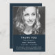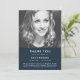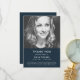 Carte de remerciements funéraire moderne et simple à remercier dans un style design minimaliste moderne en bleu marine. La carte peut être facilement personnalisée avec votre propre photo et texte pour créer une carte spéciale après les funérailles, le mémorial ou la célébration de la vie de votre être aimé. L'image montrée n'est à des fins d'illustration que pour être remplacée par votre propre photo. L'image de l'espace réservé est celle d'une belle femme aux cheveux blonds ondulés portant un haut taché et est tournée en noir et blanc monochrome.