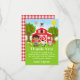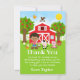 Cette carte de remerciement mignonne et amusante présente un garçon aux cheveux bruns avec une peau foncée à côté d'une grange rouge avec une girouette en forme de coq. Il y a des animaux de ferme adorables tels qu'une vache, un cochon et une poule. En arrière-plan, on voit un ciel bleu vif, des pommiers, du soleil, des papillons et des marguerites. Le texte combine des polices grasses et sans empattement pour un look stylé et moderne. C'est parfait pour une fête d'anniversaire sur le thème de la ferme.