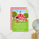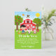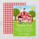 Cette carte de remerciement mignonne et amusante présente un garçon aux cheveux noirs avec une peau claire à côté d'une grange rouge avec une girouette en forme de coq. Il y a des animaux de ferme adorables tels qu'une vache, un cochon et une poule. En arrière-plan, on voit un ciel bleu vif, des pommiers, du soleil, des papillons et des marguerites. Le texte combine des polices grasses et sans serif pour un look stylé et moderne. C'est parfait pour une fête d'anniversaire sur le thème de la ferme.