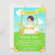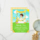 Cette carte de remerciement mignonne et fantaisiste représente un fils aux cheveux bruns avec une peau claire à un stand de limonade jaune qui est décoré de fleurs et de fanions. En arrière-plan, on voit un ciel bleu, du soleil et des papillons. Le texte combine des polices décoratives et sans empattement pour un look élégant et moderne. C'est parfait pour une fête d'anniversaire estivale.