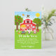 Cette carte de remerciement mignonne et amusante présente un garçon aux cheveux blonds avec une peau claire à côté d'une grange rouge avec une girouette en forme de coq. Il y a des animaux de ferme adorables tels qu'une vache, un cochon et une poule. En arrière-plan, on voit un ciel bleu vif, des pommiers, du soleil, des papillons et des marguerites. Le texte combine des polices grasses et sans empattements pour un look élégant et moderne. C'est parfait pour une fête d'anniversaire sur le thème de la ferme.