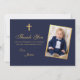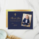 Une simple mais élégante carte de remerciement pour un baptême. Sur le côté droit, il y a une photo en biais dans un cadre doré imitation. À gauche, sous une croix dorée imitation, le texte est écrit en lettres dorées, avec les mots Merci et la signature dans un élégant script calligraphique. Le fond est bleu marine, le dos est en dorure imitation.