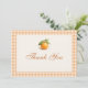 Gingham orange Little Cutie baby shower thank you card featuring sweet citrus accents and a classic gingham pattern. Perfect for sending heartfelt thanks after a Little Cutie themed baby shower. Ideal for summer, citrus inspired, and gender neutral celebrations. Customizable text for a personal message. Print ready layout.